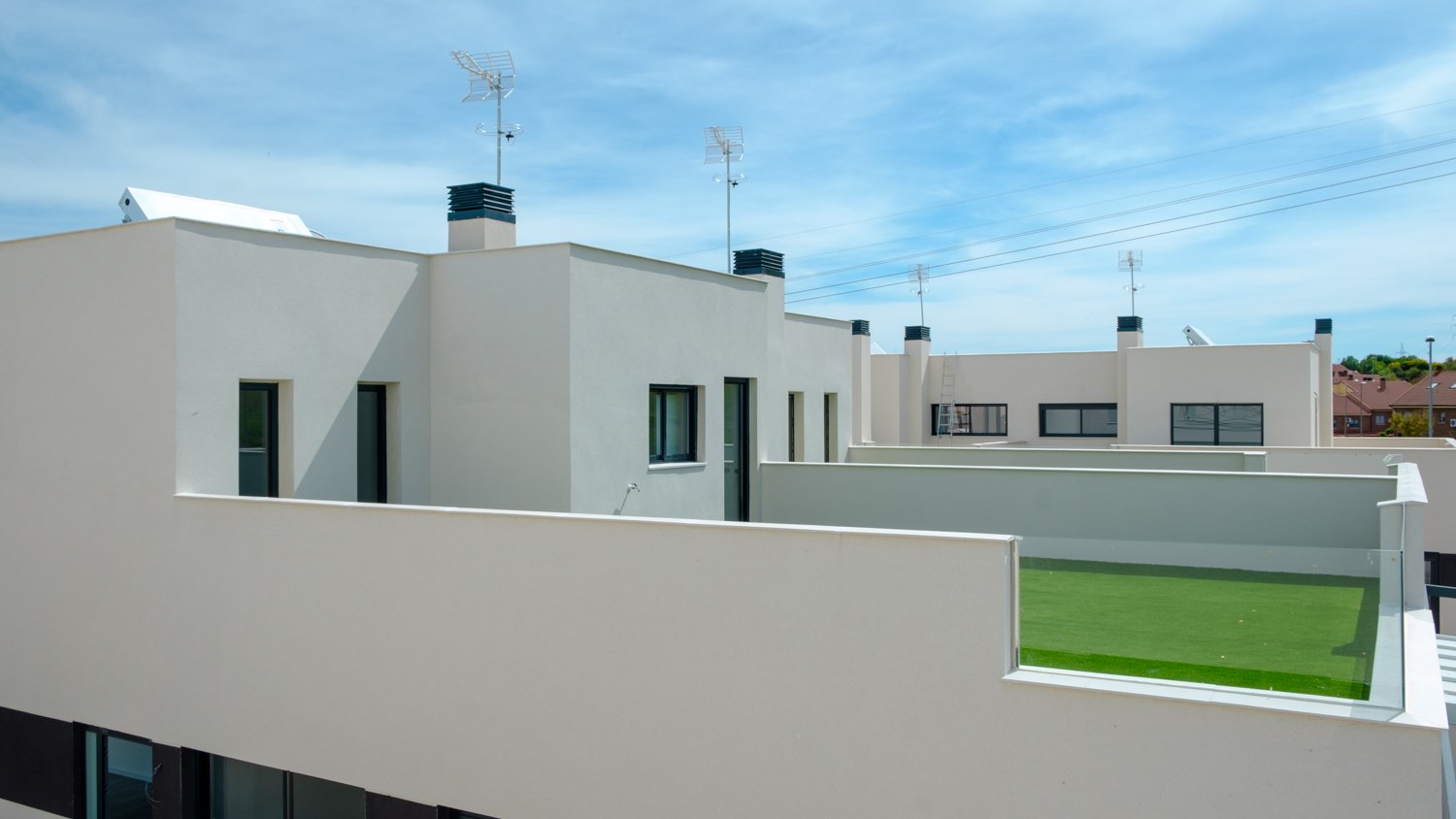 Se entregan con cocina amueblada y todos disponen de amplias azoteas con césped artificial, que recupera el terreno ocupado por la edificación en la planta superior.